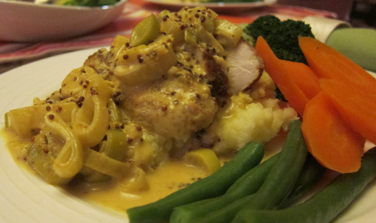 On a medium-heat pan, fry the breasts with minimal oil for say 8 mins until the skin is golden and crispy. Drain the excess fat, there will be enough fat in the sauce ! Flip the breasts, add some chopped leeks and garlic – as much as you want. Add stock, seeded mustard and simmer for 4 mins covered.