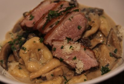 Okidoki, now to put it all together. Simmer the gnocchi in well seasoned swirling water. When it floats to the surface, remove and place into simmering creamy sauce. When all is done, plate up and place sliced duck breast on top.