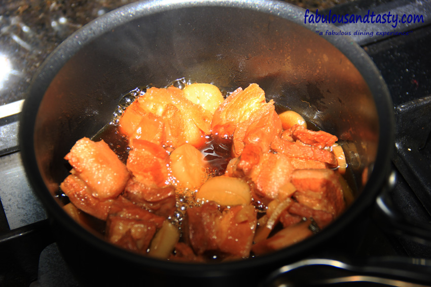 Cube a piece of pork belly into large chunks, as they will shrink a little in the cooking process. Place the cubes in water with some ginger and spring onions and simmer for about 20 mins and remove any scum that appears on the surface.